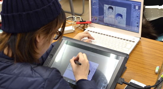 | 2年次の主なカリキュラム | ■キャラデザイン設定 ■カラーイラストPC ■ストーリー展開テク ■PCマンガ技法 ■空間構成法 ■キャラデザインプロ ■PC着色プロ ■コマ割り演出法 ■PCマンガプロ ■背景仕上げプロ ■制作実習(週4回 各120分) 高度な応用力を修得し、プロのレベルを目指します。 |
