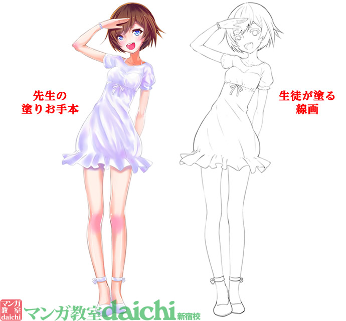 下の絵は左が先生が塗った見本で、右の線画に色を塗っていきます。